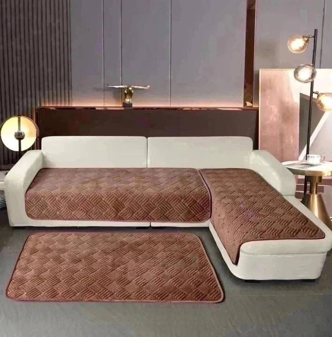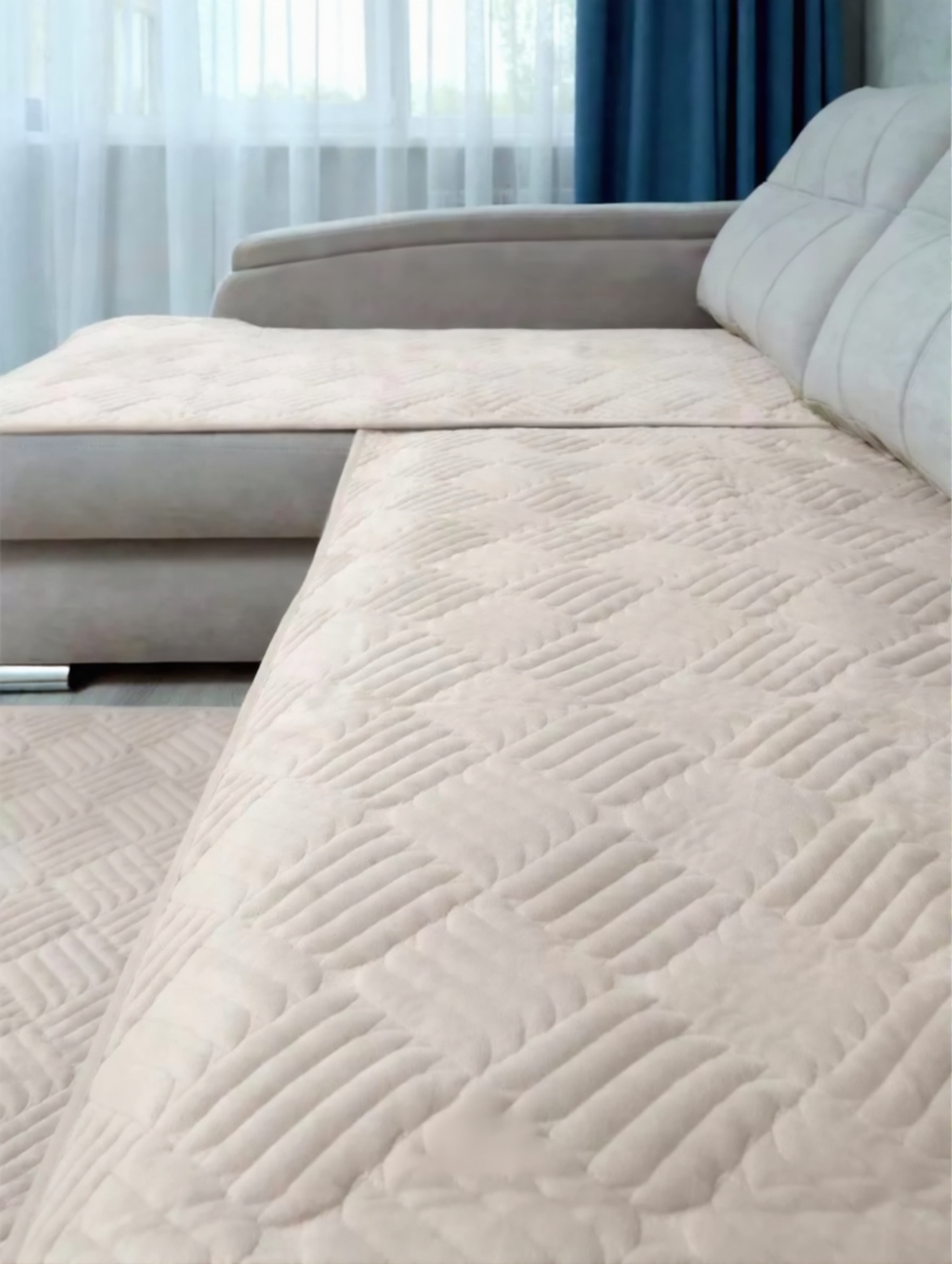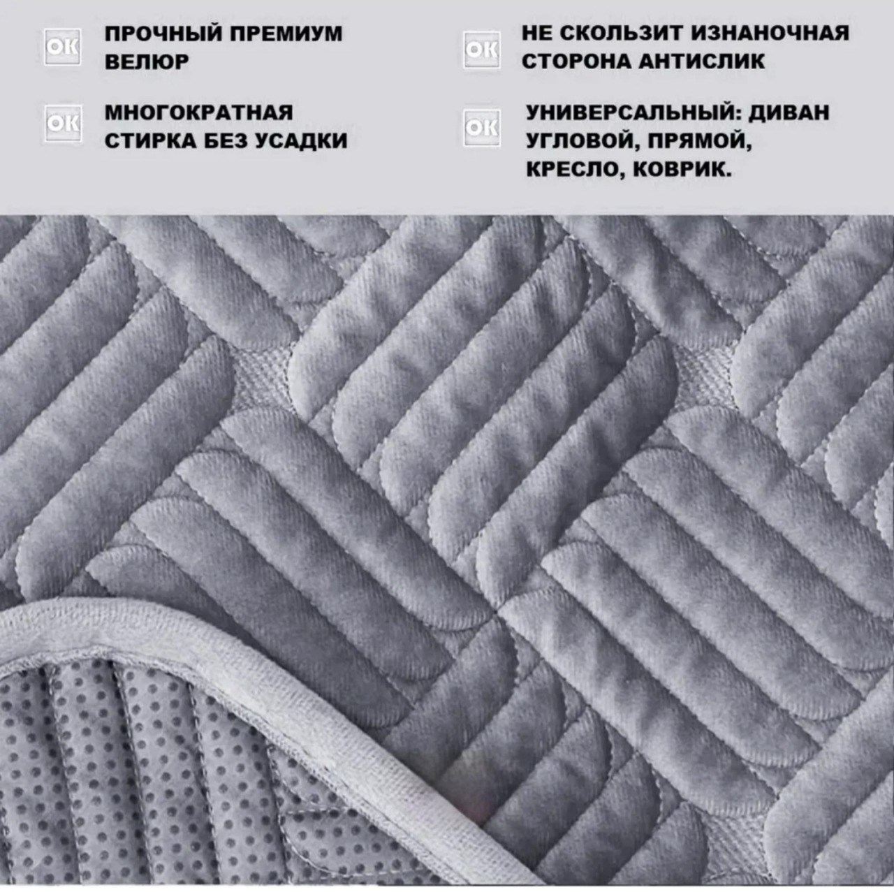Материал ткани премиум качества : велюр - мягкий , приятный на ощупь, прочный, плотный, износостойкий, легкий в уходе, держит форму и не садится после стирки, обратная сторона с прорезиненным противоскользящим покрытием, для лучшего прилегания на поверхность вашей мягкой мебели, не скользит, подойдет даже для кожаных изделий.